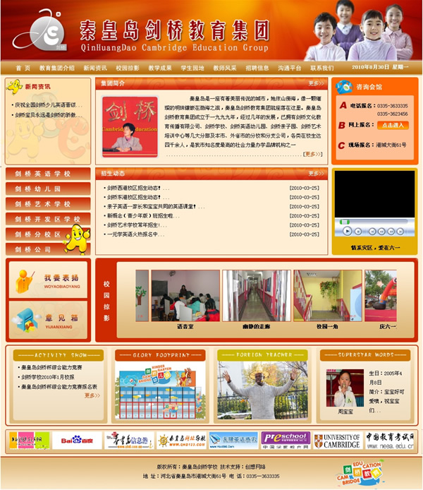 秦皇島是一座有著美麗傳說的城市,她依山傍海,像一顆璀璨的明珠鑲嵌在渤海之濱,秦皇島劍橋教育集團(tuán)就座落在這里。秦皇島劍橋教育集團(tuán)成立于一九九九年,經(jīng)過幾年的發(fā)展,已擁有劍橋文化教育傳播有限公司、劍橋?qū)W校、劍橋英語幼兒園、劍橋親子園、劍橋藝術(shù)培訓(xùn)中心等幾大分部及本市、外省市的分校和分支公司,各類在校生達(dá)四千余人,是我市知名度高的社會(huì)力量辦學(xué)品牌機(jī)構(gòu)之一 。