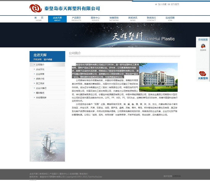 秦皇島市天暉塑料有限公司是一家專業(yè)塑料化工原 料銷售、塑料產(chǎn)品加工等多元化發(fā)展企業(yè)。多年來,公司緊緊圍繞市場需求,著眼于企業(yè)的長遠發(fā)展,相繼成立了秦皇島市恒捷塑料有限公司、 葫蘆島慧達塑料制品有限公司、盤錦寨達化工商貿(mào)有限公司,固定資產(chǎn)超過一億元。塑料原料年銷售80余萬噸,年銷售額逾80億元。