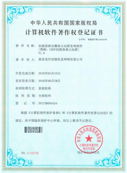 創(chuàng)想易維全媒體云站群系統(tǒng)軟件著作權(quán)證書日前正式獲得國家版權(quán)局批準(zhǔn),創(chuàng)想公司在云平臺(tái)、智慧型、大數(shù)據(jù)應(yīng)用的自主產(chǎn)品研發(fā)的道路上將奮勇前進(jìn),越飛越高。
